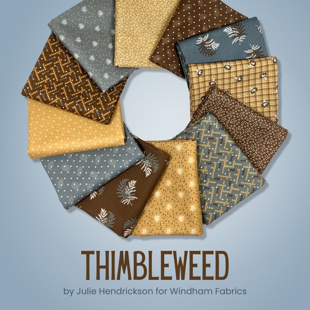 Warm, nostalgic, and rich with texture, Thimbleweed by Julie Hendrickson for Windham Fabrics captures the charm of traditional quilting with a timeless, earthy palette. This 12 piece half yard bundle features beautifully detailed small-scale prints in shades of honey gold, warm brown, soft blue-grey, and gentle cream, accented with classic florals, geometrics, and ditsy motifs.