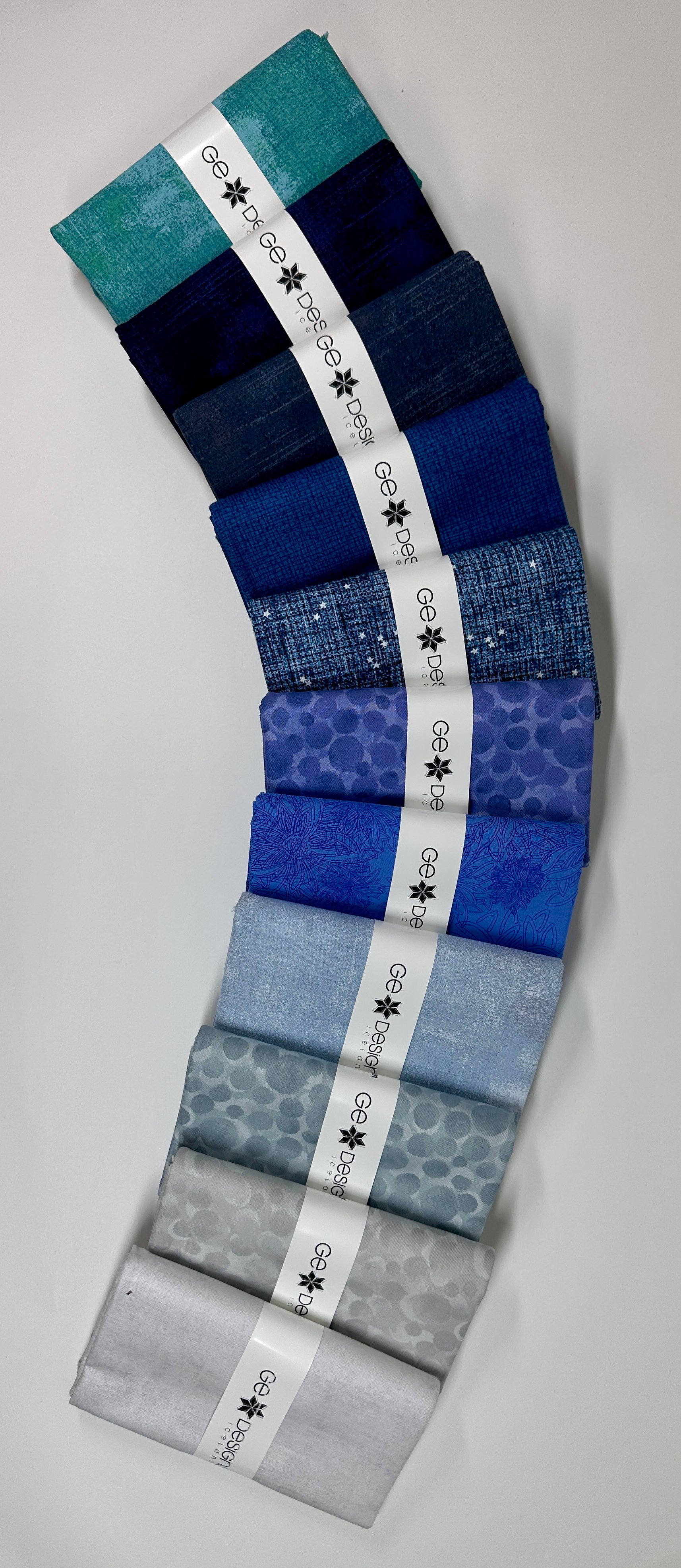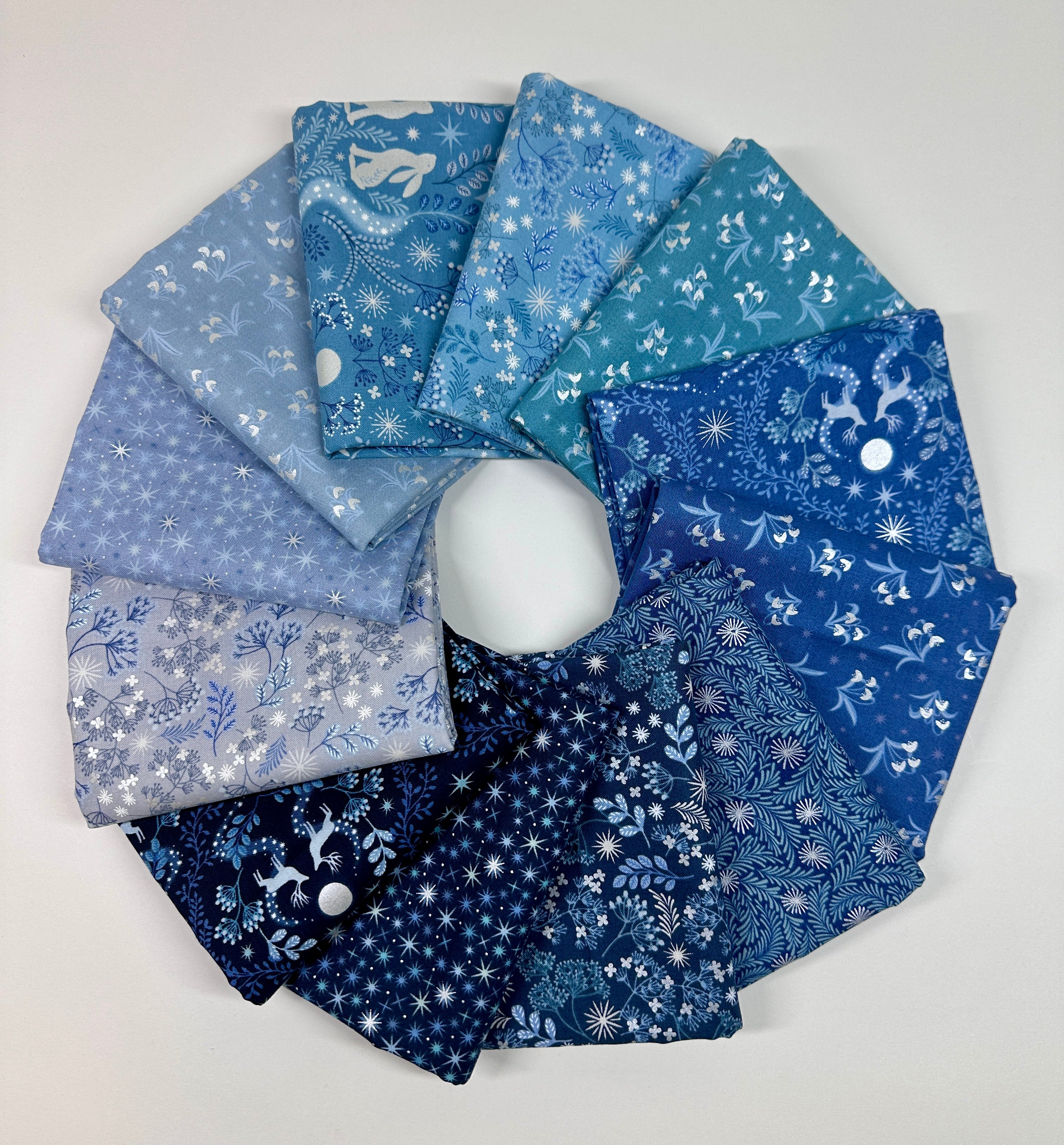 Each print features delicate metallic details—twinkling stars, silver-dusted florals, graceful deer, and woodland branches—all in a cool, cohesive palette of icy blues, silvers, and deep midnight hues. From soft sky tones to rich twilight navy, these fabrics transition seamlessly through the shades of winter dusk.