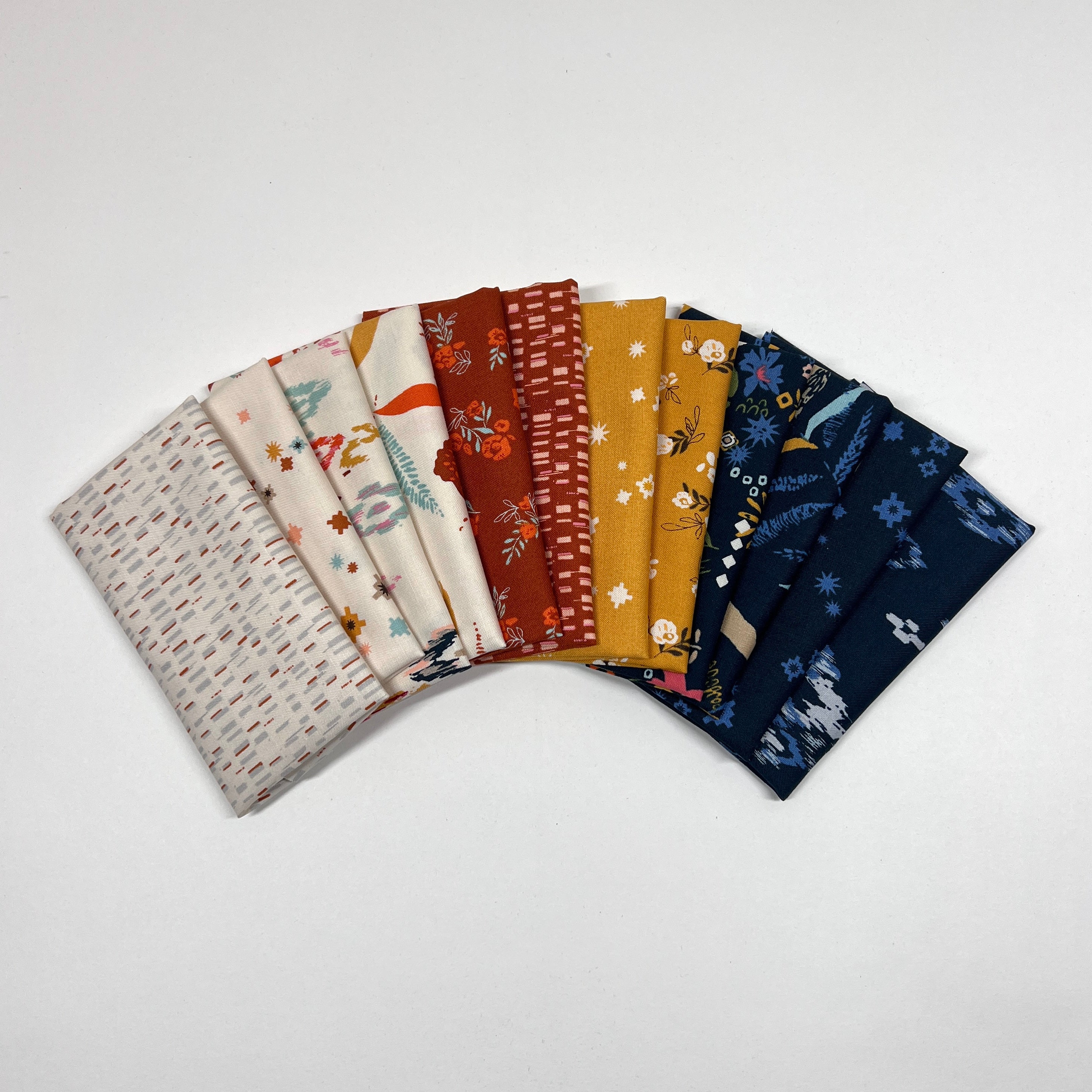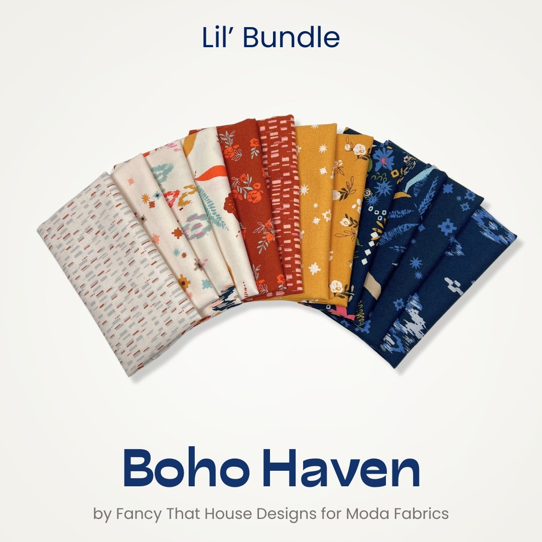 The Boho Haven Lil' Bundle includes 12- 6"x21" cuts of fabric from the Boho Haven collection by Fancy That Design House for Moda Fabrics to create any GE Designs Lil' Table Runner. The lil bundle does not include fabric for 1/4 yard of binding.