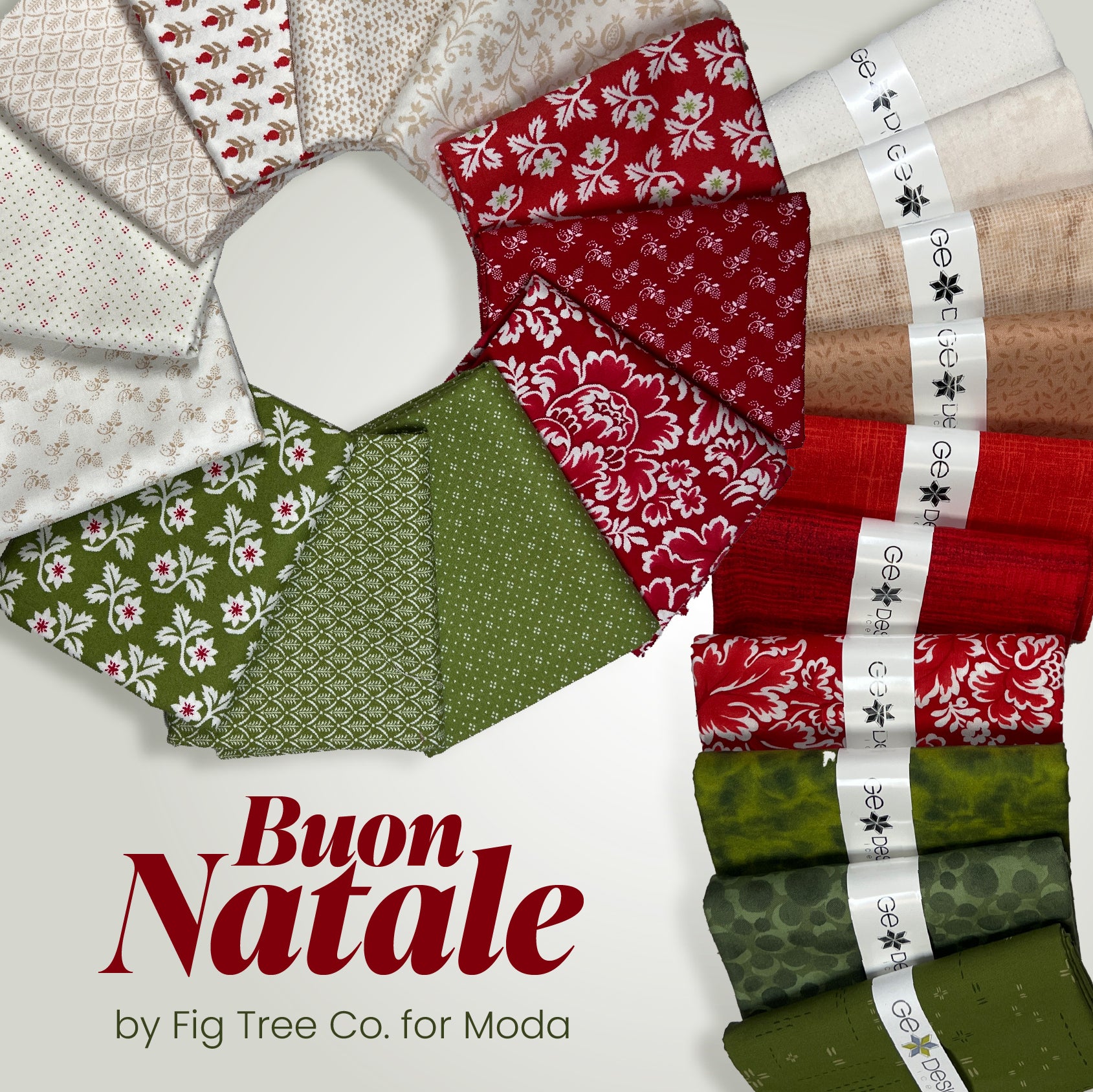 Celebrate the spirit of the season with the Buon Natale collection by Fig Tree Co. for Moda Fabrics! This festive 12-piece bundle features a gorgeous palette of traditional Christmas colors—rich cranberry reds, fresh pine greens, and creamy ivories—all brought to life through delicate floral sprays, timeless paisleys, and elegant geometrics.