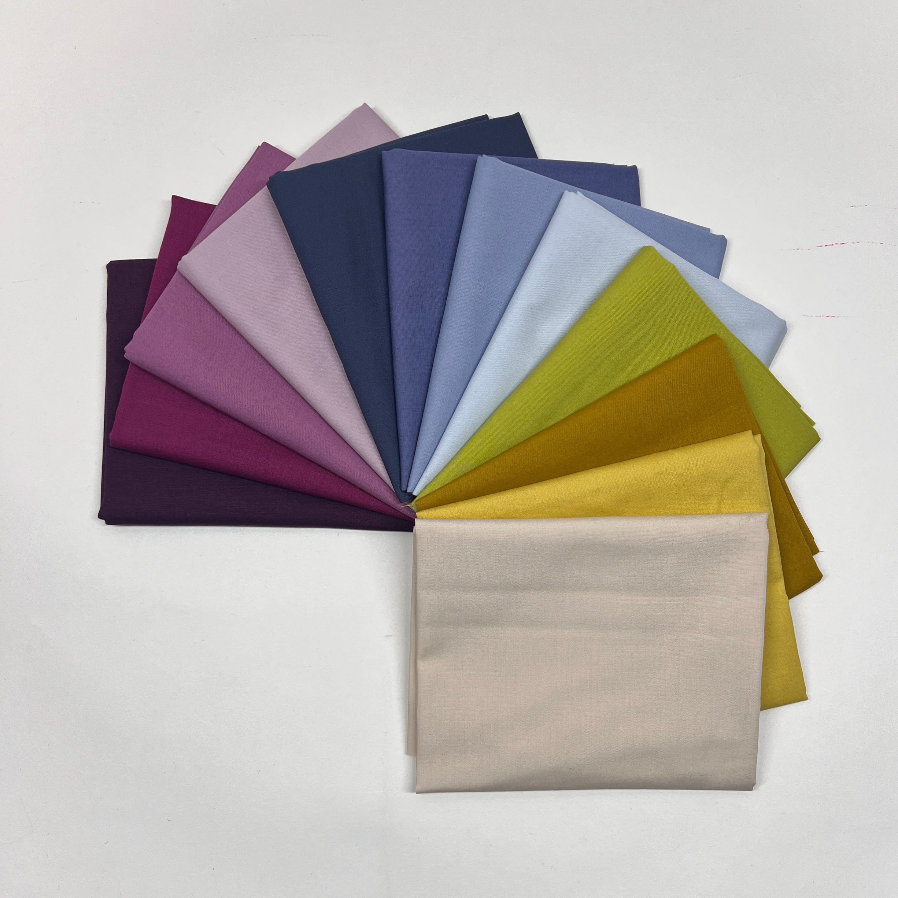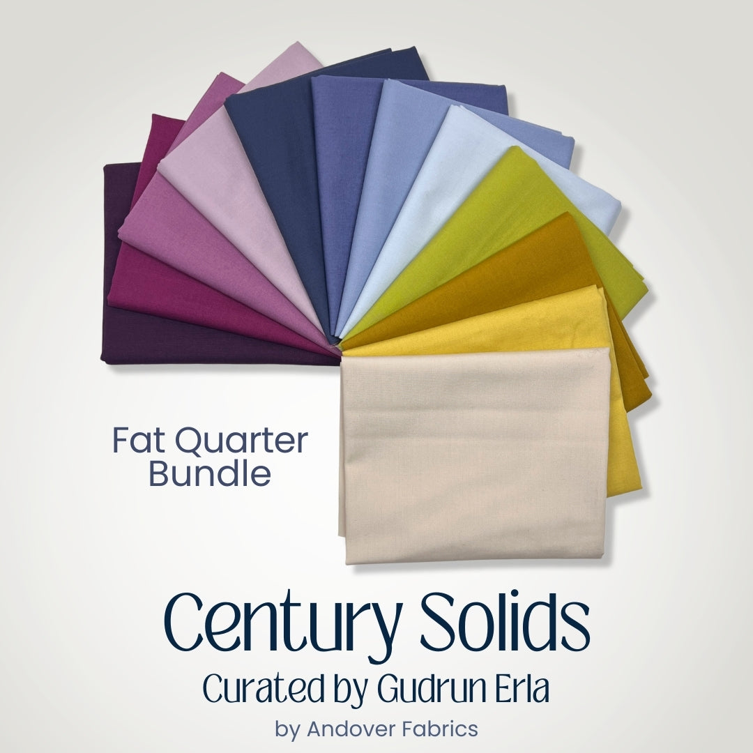 This beautifully curated Century Solids fat quarter bundle by Andover Fabrics features 12 rich, modern solid colors that work effortlessly together. From soft neutrals and cool blues to warm golden tones and deep berry hues, this palette offers a balanced mix thatās perfect for both bold statement quilts and elegant, understated projects.
