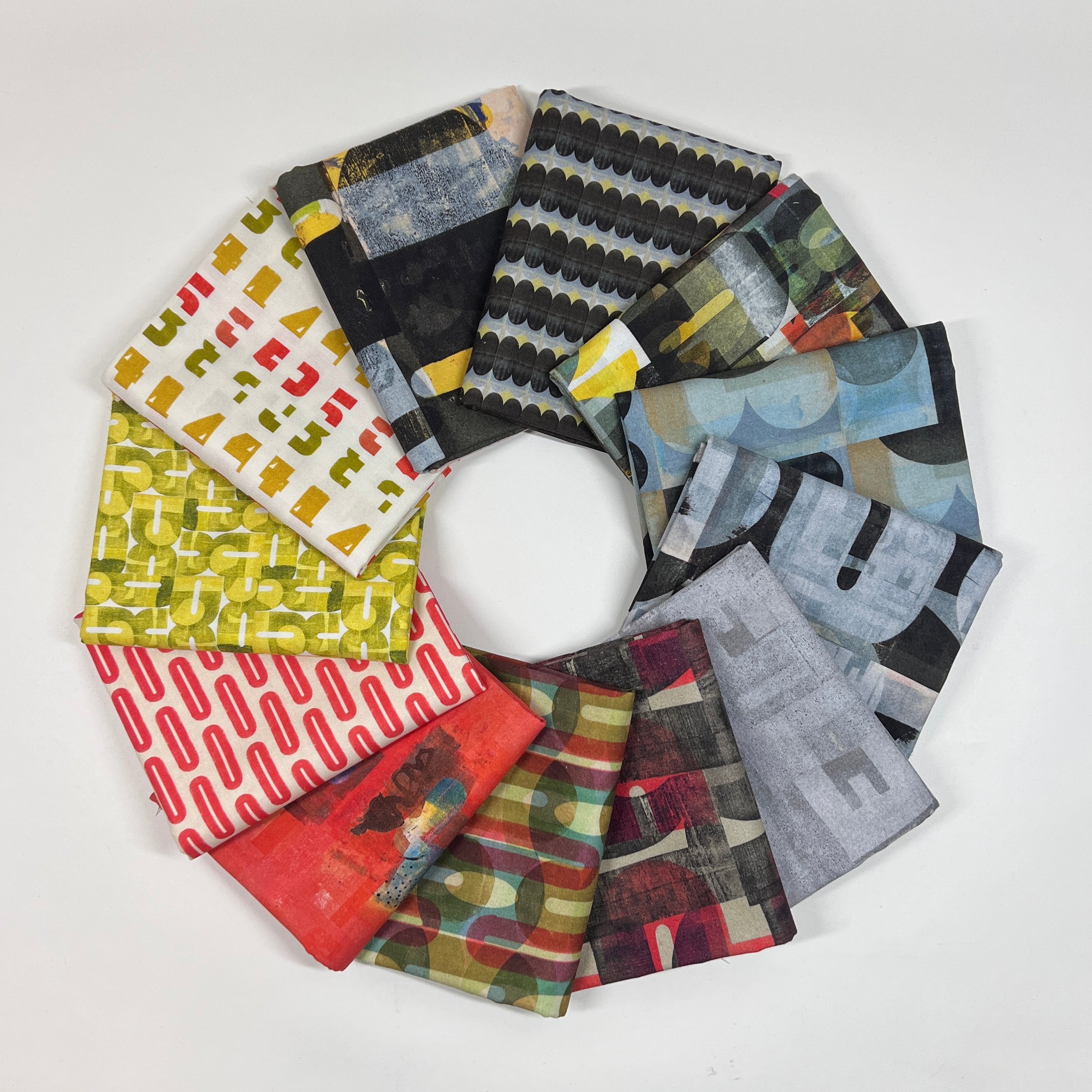 Bold, graphic, and effortlessly modern, Counter by eBond is a striking collection that plays with repetition, texture, and rhythm. This 12 piece half yard bundle features a curated mix of prints that blend painterly marks, layered shapes, and subtle grunge textures in a sophisticated palette of earthy neutrals, muted brights, and inky contrasts.