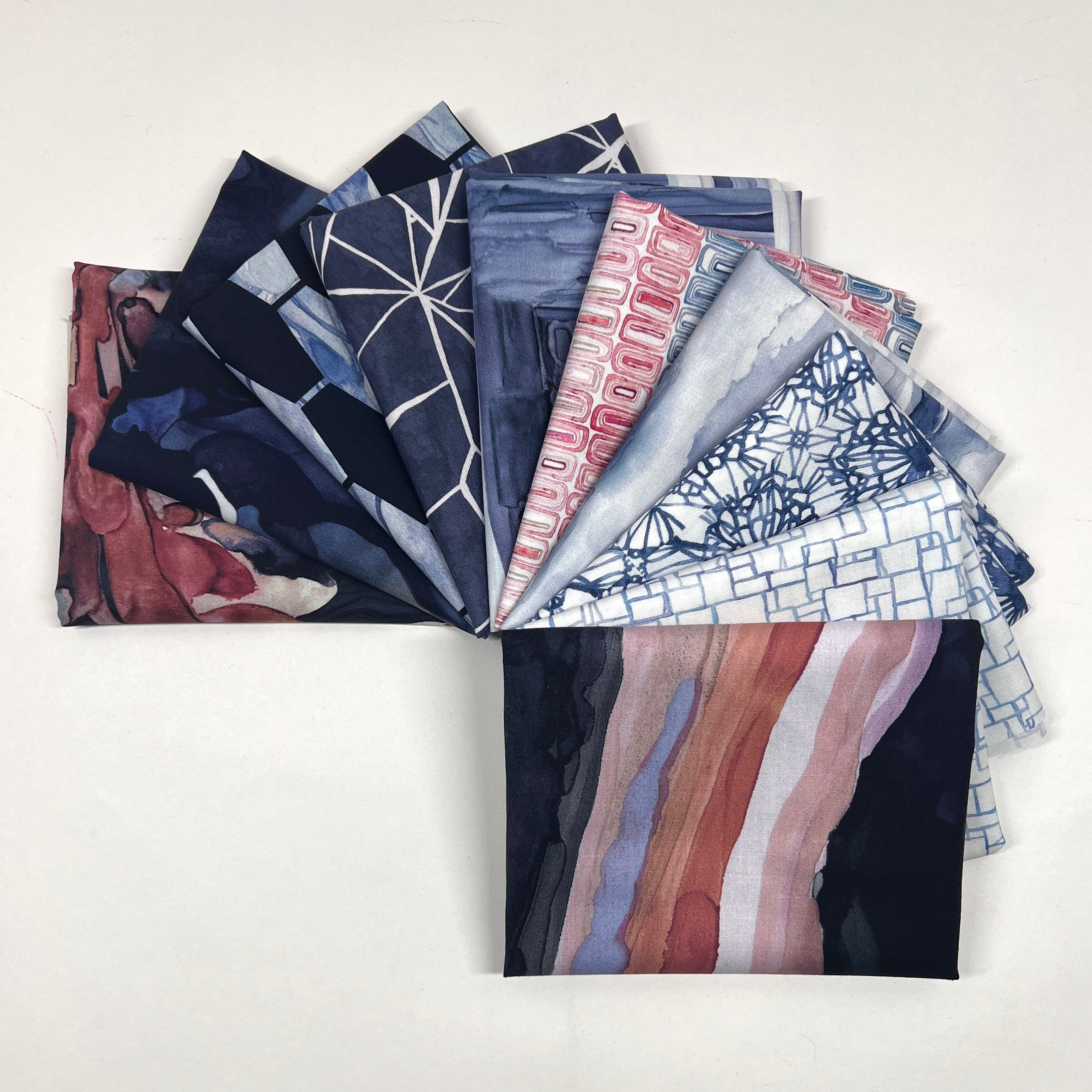 Inspired by the quiet beauty of early morning light, Daybreak by Shell Rummel features soft watercolor textures, layered brushstrokes, and modern geometric elements, with a sophisticated palette of inky blues, misty grays, soft blush, and warm neutrals that captures the calm transition from night to day. This 10 piece fat quarter bundle offers a beautifully coordinated selection of prints
