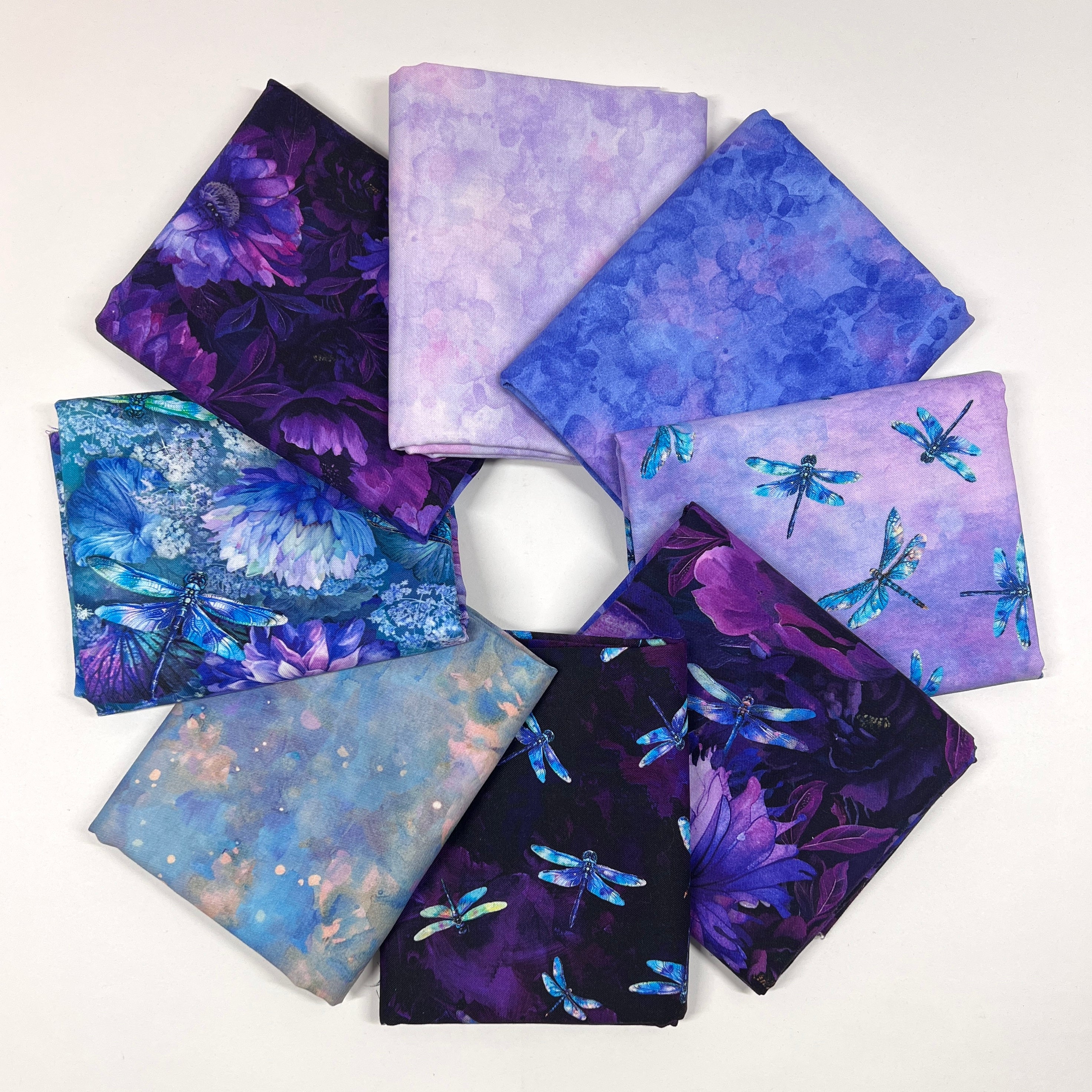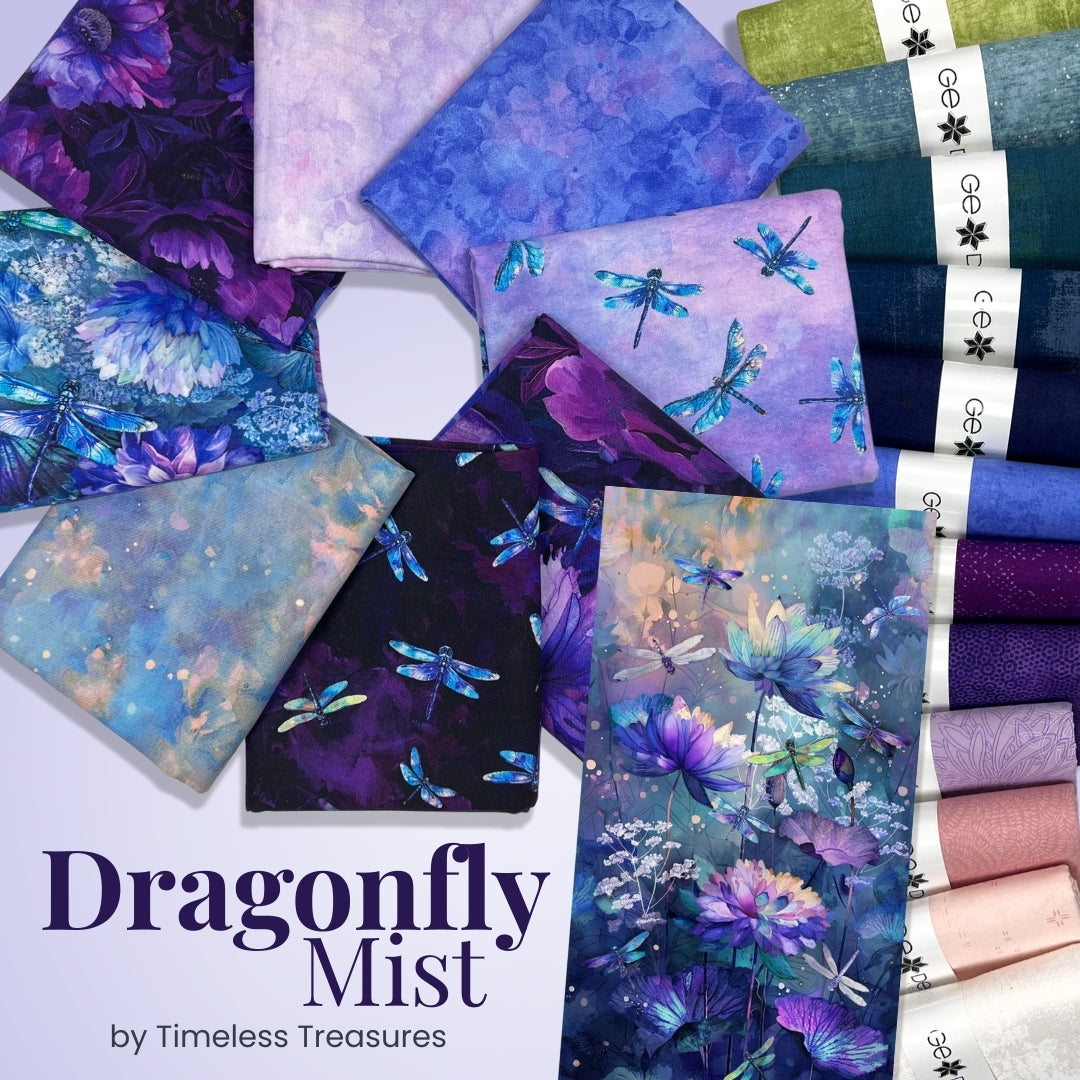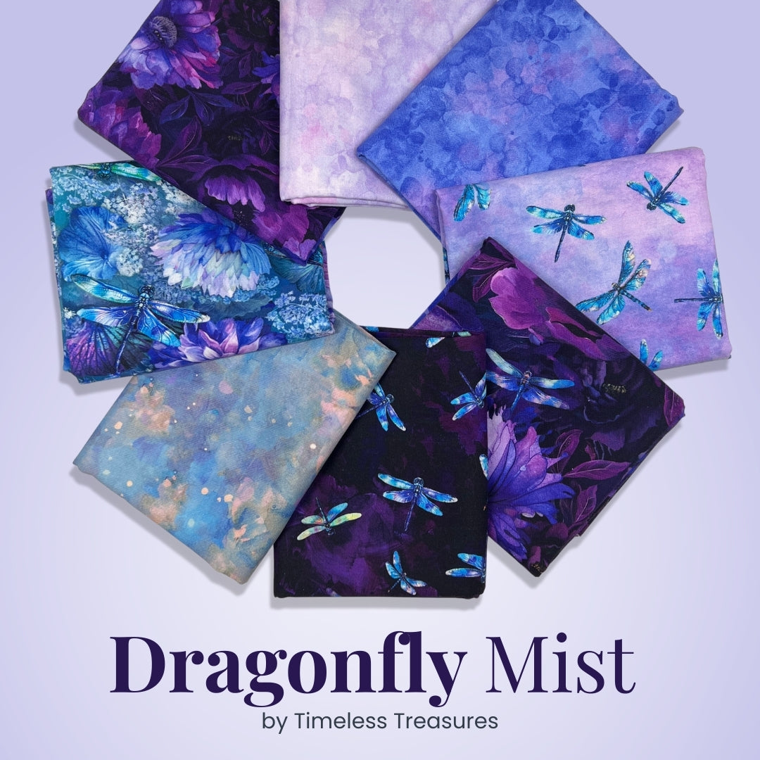 Soft, dreamy, and luminous, Dragonfly Mist by Timeless Treasures is a tranquil collection inspired by twilight gardens and shimmering wings in motion. This 8 piece half yard bundle blends delicate dragonflies with watercolor-style textures and floral impressions in a soothing palette of purples, lavenders, indigos, and misty blues.