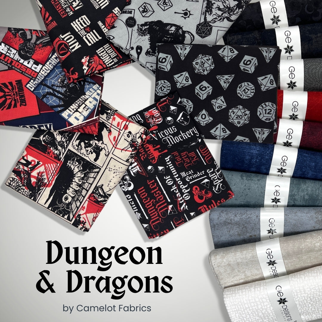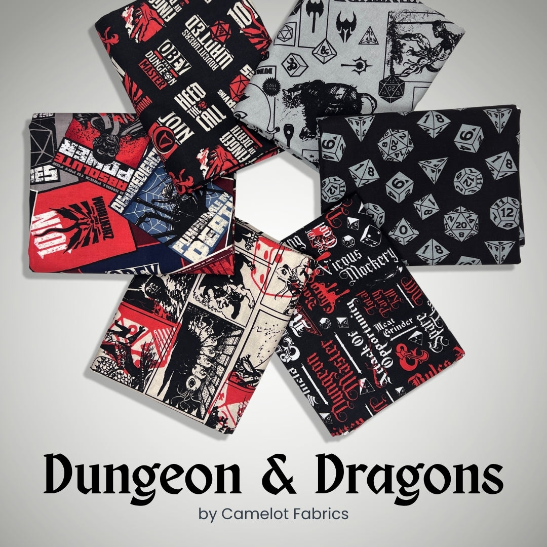 Step into a world of adventure with the Dungeons & Dragons fabric collection by Camelot Fabrics. This 6 piece half yard bundle captures the iconic spirit of the legendary tabletop game with bold graphics, classic symbols, and dramatic typography inspired by fantasy lore and epic quests.