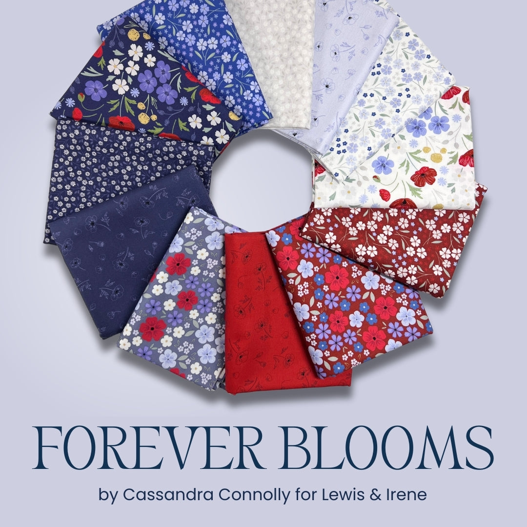 Celebrate the timeless beauty of florals with the Forever Blooms collection, designed by Cassandra Connolly for Lewis & Irene. This gorgeous 12-piece half-yard bundle brings together a harmonious blend of blossoms, leaves, and ditsy prints in a rich palette of deep navy, vibrant red, soft lavender, and fresh white.