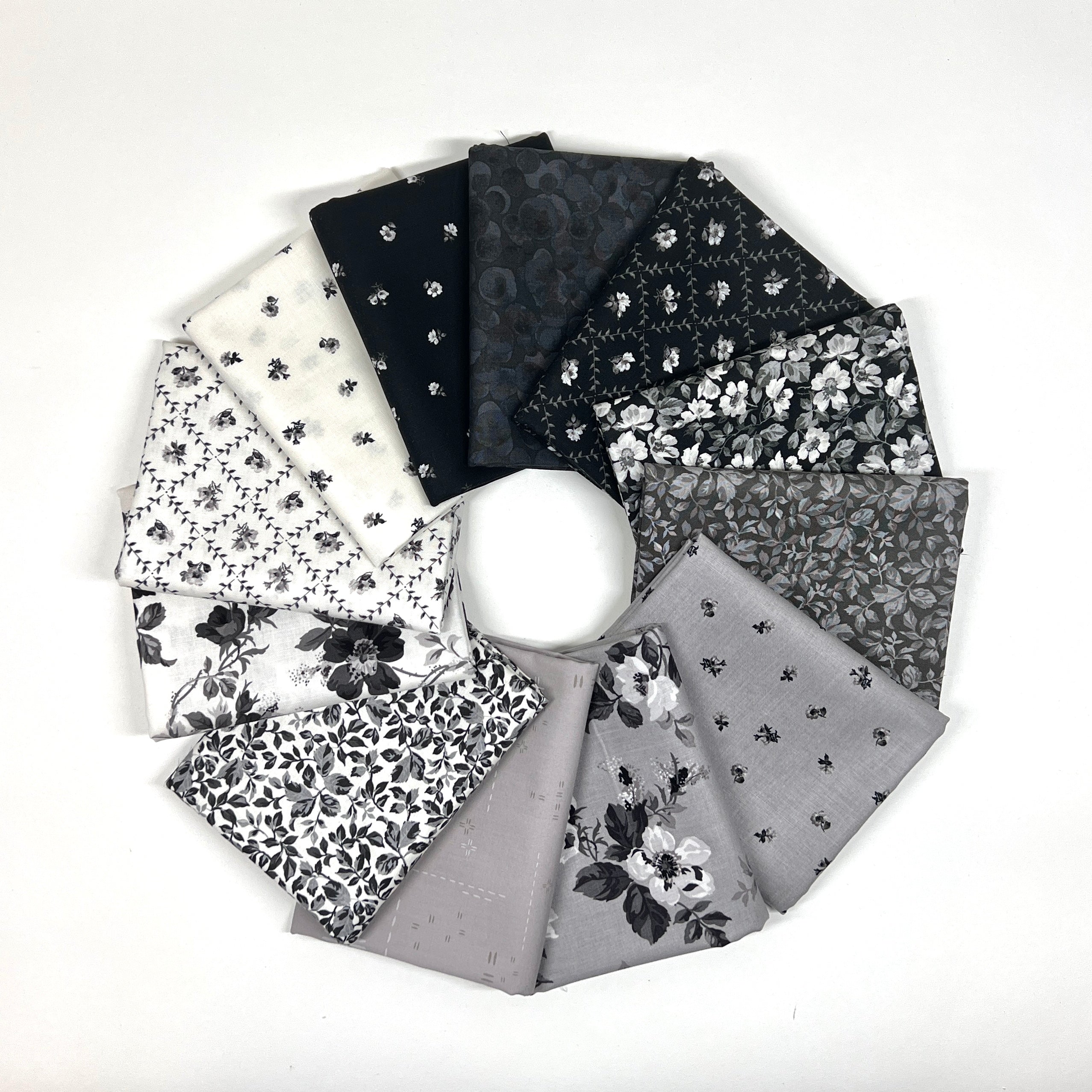 The Ink and Ivory collection by Riley Blake Designs is a stunning study in contrast, blending rich inky blacks with soft ivory and graceful shades of gray. This 12-piece half yard bundle features an elegant mix of florals, delicate vines, subtle tone-on-tones, and petite prints that work beautifully together for a refined, cohesive look.