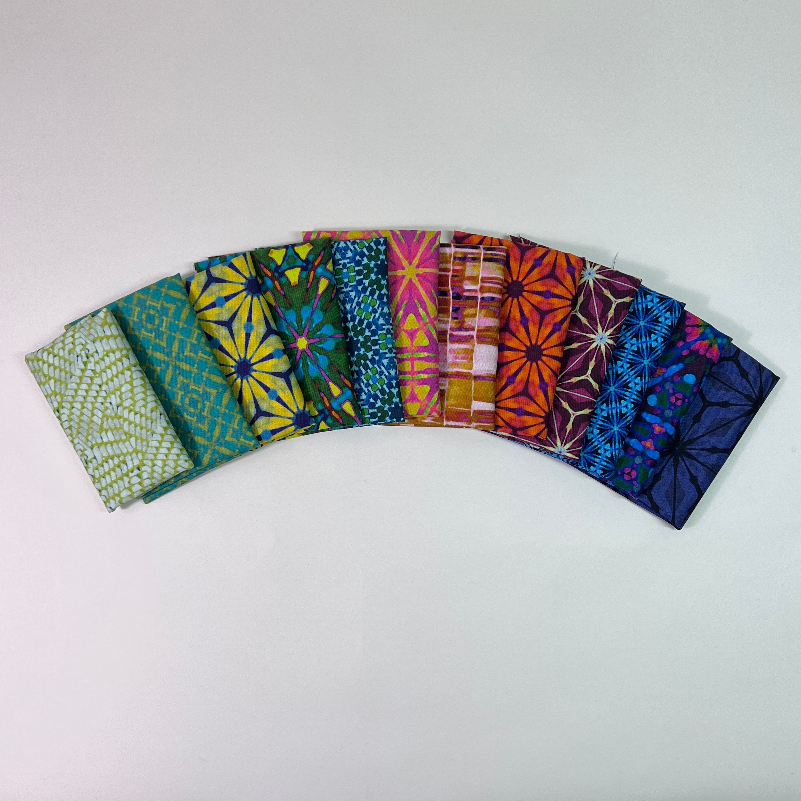 The Kaleidoscope Lil' Bundle includes 12- 6"x21" cuts of fabric from the Kaleidoscope collection by Billy Reue for FreeSirit Fabrics to create any GE Designs Lil' Table Runner. The lil bundle does not include fabric for 1/4 yard of binding.