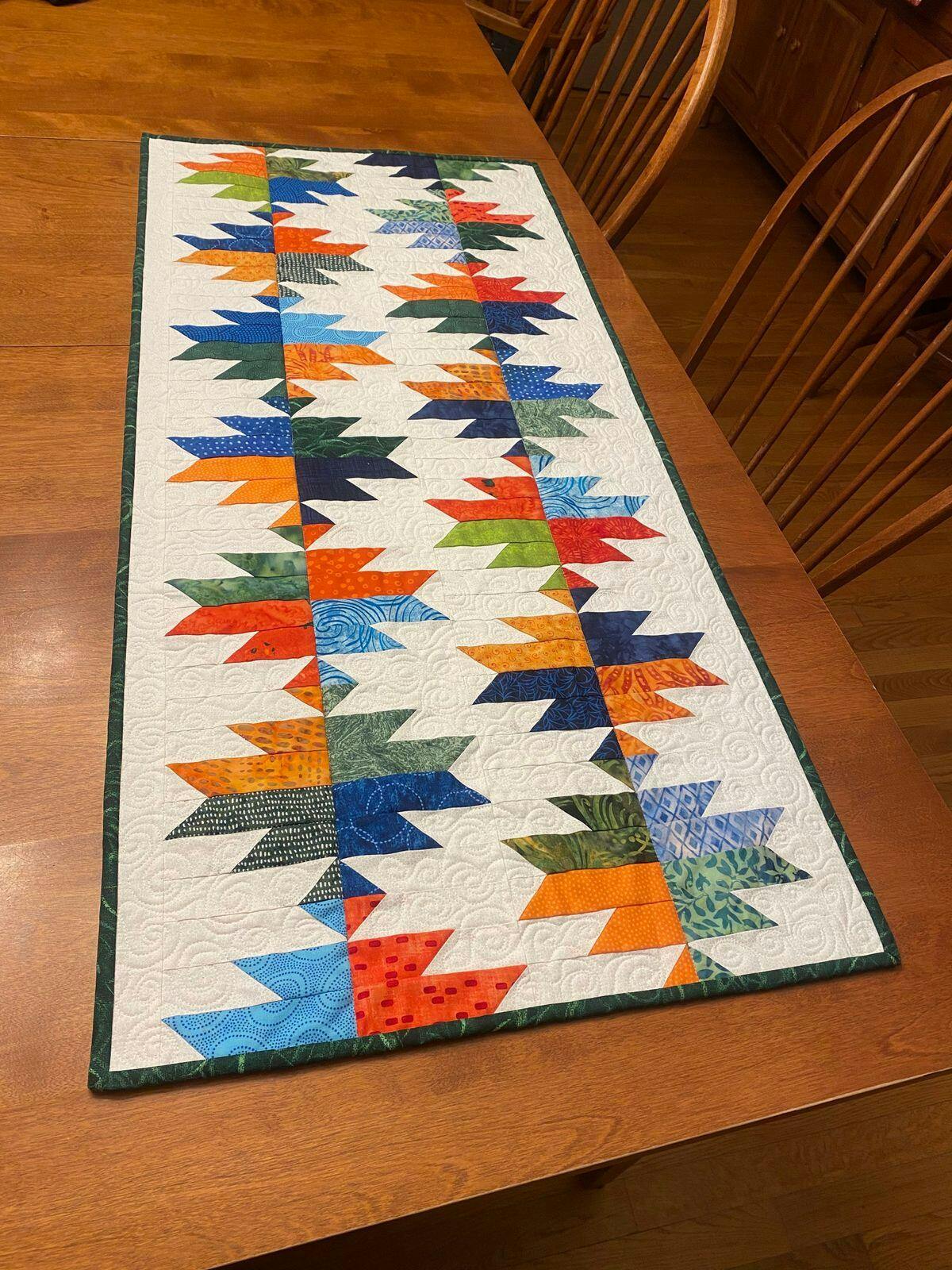 This table runner comes together much easier then it looks using the Stripology Squared Mini Ruler and 5" fabric squares, plus some background. Full color instructions include how to use regular rulers as well. Size 18" x 39".