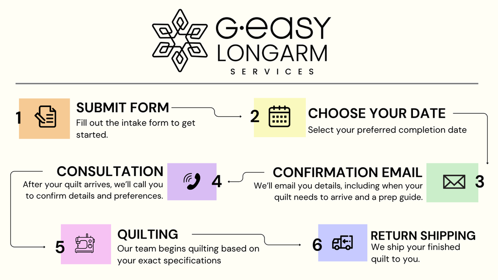 Once you select your date, you’ll receive a confirmation email with easy shipping instructions and a helpful prep guide to get your quilt ready for quilting. After your quilt arrives, our expert team will call you for a personalized consultation to make sure every detail is perfect before we begin.