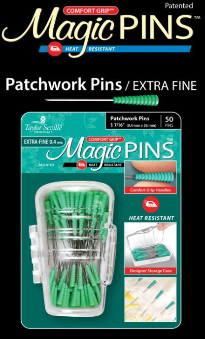 Comfort Grip, Heat Resistant, 50pc. Taylor Seville Originals Notions make your sewing life easier. The Comfort Grip Magic Pins Extra Fine Patchwork are 1.75in and .4mm. They have a comfort grip head that makes picking up and maintaining a grip on the pin, easy. The Comfort Grip Magic Pins are also heat resistant, so if you iron over them, they will not be ruined. The pins come in a designer storage case that closes, so you won’t lose any pins!
