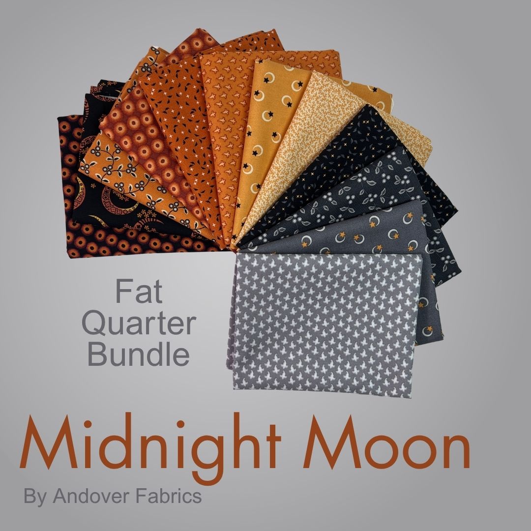 Step into a world of mystical charm and autumn elegance with the Midnight Moon fabric bundle by Andover Fabrics. This 12-piece half-yard collection conjures up a rich palette of pumpkin orange, charcoal gray, golden amber, and inky black, making it the perfect companion for fall and Halloween-themed creations - or any project that needs a touch of moody magic.