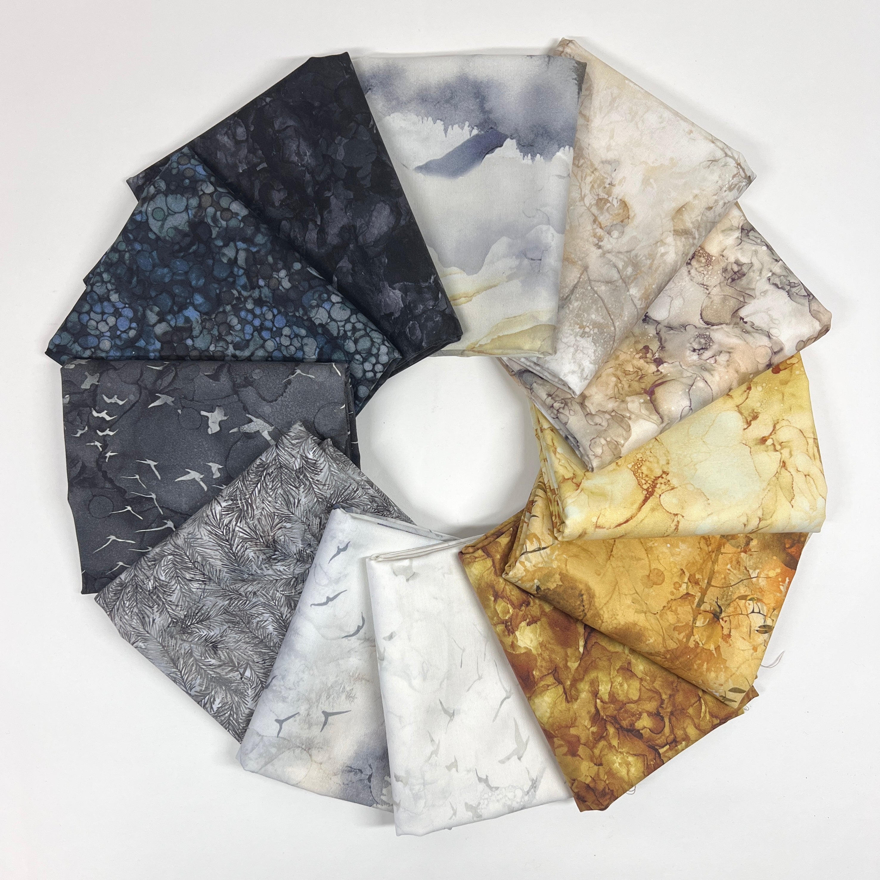 Capture the quiet beauty of a new day with Misty Morning, a serene 12-piece half yard bundle designed by Deborah Edwards for Northcott Fabrics. Inspired by soft fog, weathered stone, and the first golden light of sunrise, this collection blends moody charcoals and deep navy tones with gentle greys, warm taupes, and glowing amber hues.