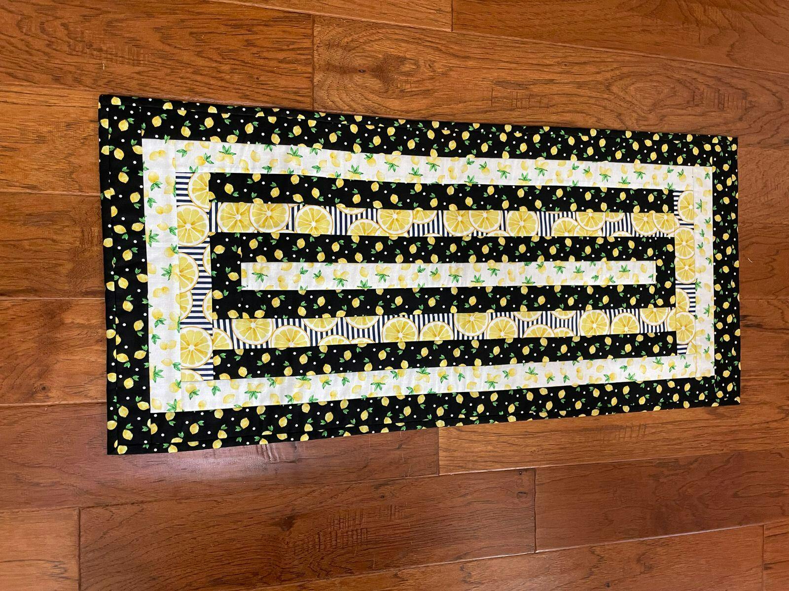 Very simple yet elegant runner that fits perfectly for any occasion. It is super fast and easy with the great “Quilt as you go” method and it only takes one Charm Pack to make plus some binding. It measures 11-1/2”x 28-1/2” and can be finished in one evening.