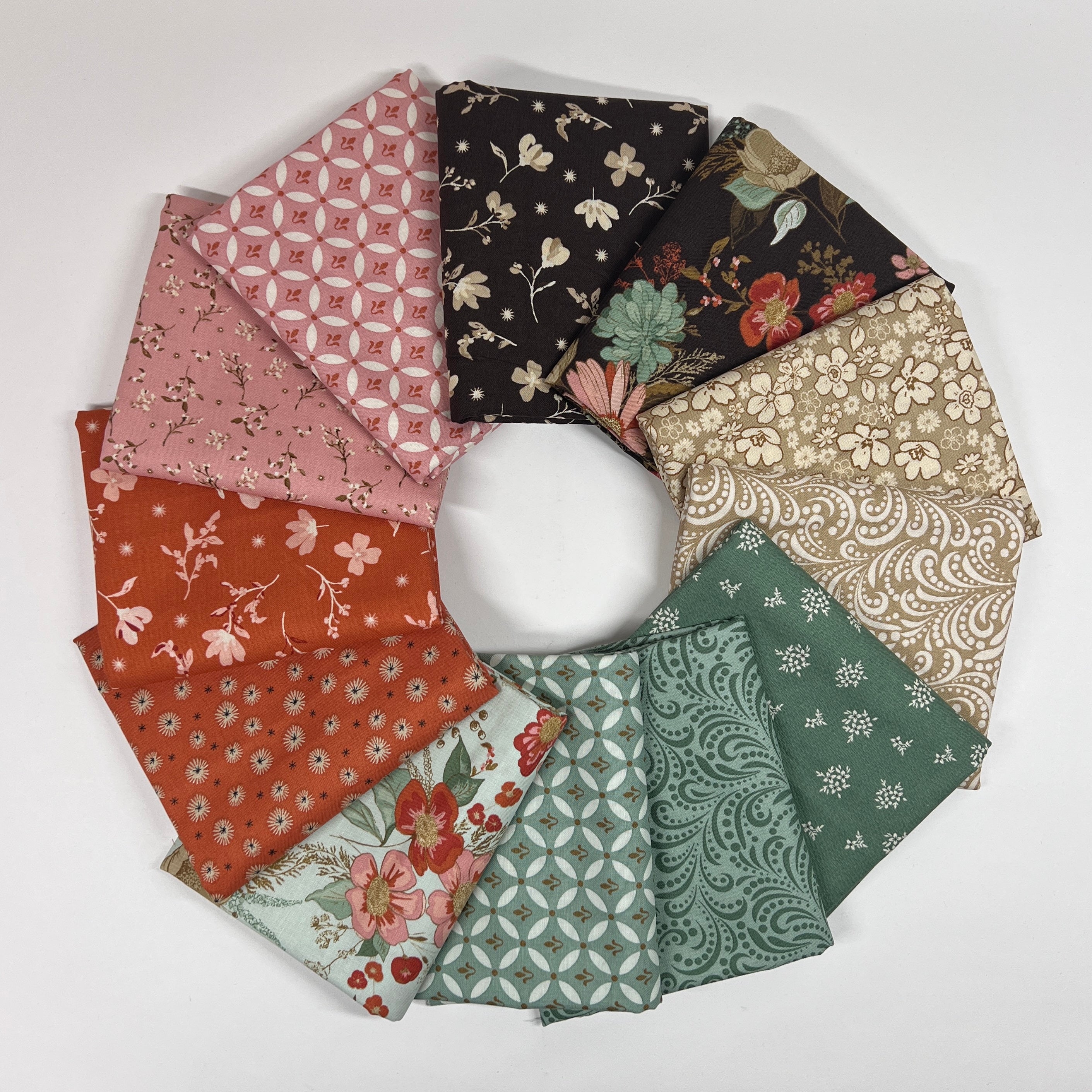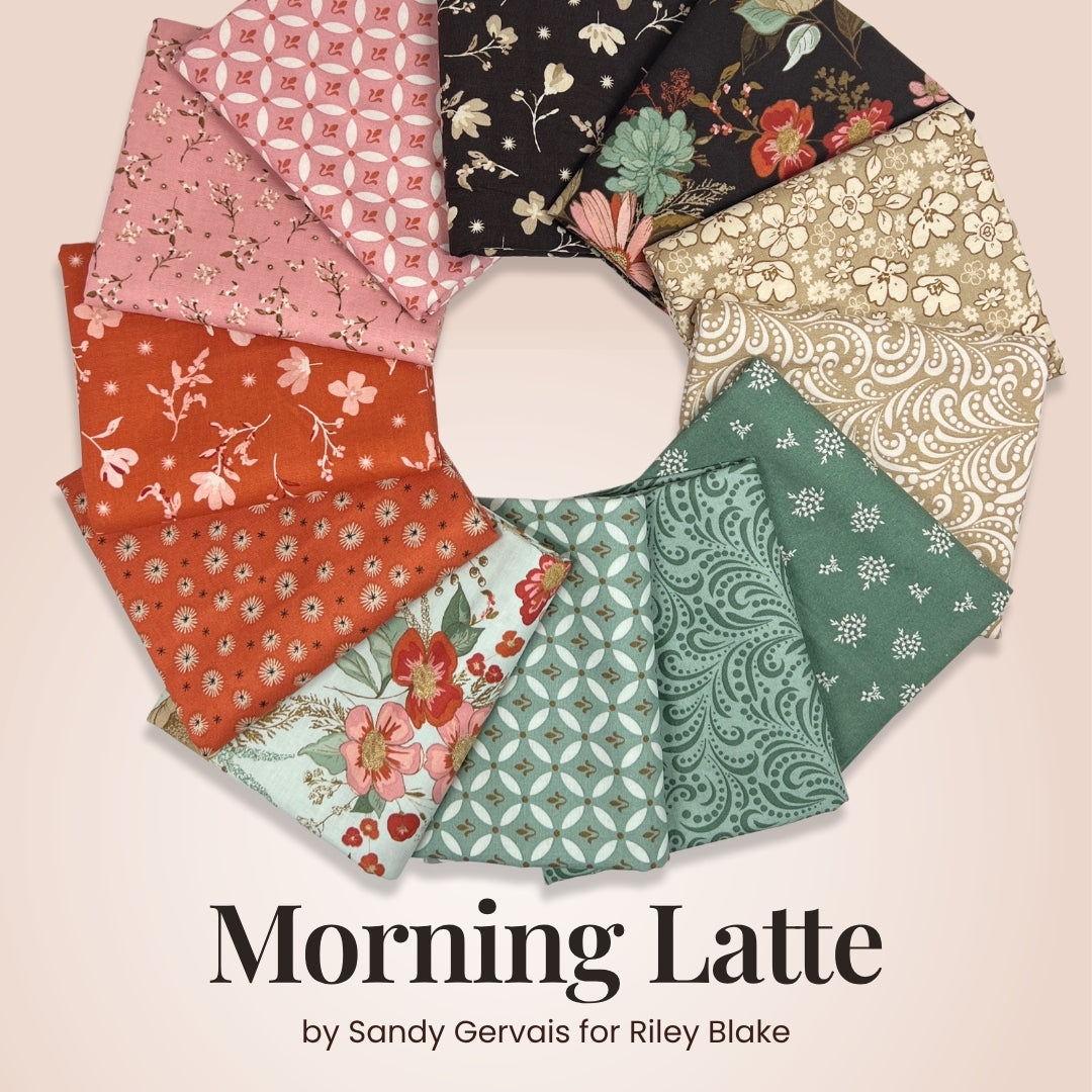 Morning Latte by Sandy Gervais for Riley Blake Fabrics - a quilting fabric collection that captures the hush of early-morning light and the warm glow of a favorite café brew. The line weaves together delicate floral motifs, graceful swirls, decorative tile-inspired designs, subtle stripes and sprigs of foliage to create a fabric story that is refined yet welcoming. The palette features creamy neutrals, latte browns, sage and soft greens, warm pinks, spice tones and deeper espresso accents—bringing both warmth and contrast to the mix.
