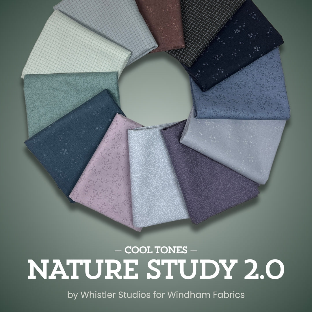 Explore the calm elegance of the natural world with Nature Study 2.0, a curated 12-piece half yard bundle from Whistler Studios for Windham Fabrics. This tranquil collection captures the essence of organic beauty with a modern twist—featuring delicate tonal prints, subtle textures, and earthy hues that shift from misty lilac and cool slate to rich evergreen and weathered brick.