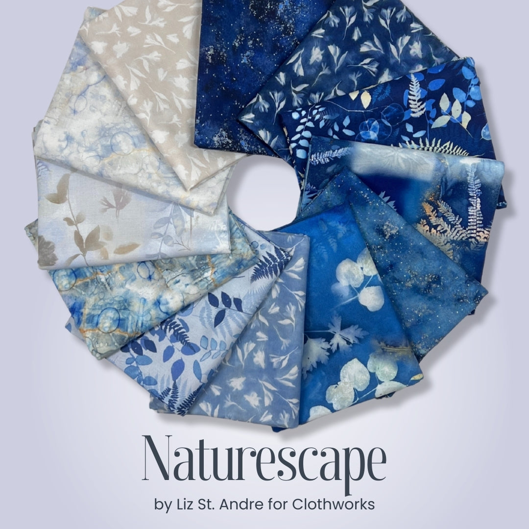 Bring the calm beauty of the natural world into your next quilt with Naturescape, a stunning fabric collection designed by Liz St. André for Clothworks. This 12-piece half yard bundle features a soothing palette of blues, soft neutrals, and organic motifs inspired by leaves, branches, textures, and quiet landscapes.