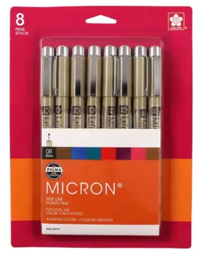 Bring your illustrations to life with 08 Pigma Micron pens now available in the full range of 17 colors. These bold point pens take no special care to use, making them accessible for beginners while allowing experienced artists to work distraction-free These pens are ideal for anime, illustration, cartooning, pen-and-ink drawing, scrapbooking, and other detail work. Pigma ink is permanent, fade resistant, chemically stable, and will not bleed or run after the ink has dried. Invented by Sakura over 30 years ago, Pigma ink continues to be the most reliable permanent ink on the market today. Artists, archivists, crafters, journal enthusiasts, students, and scientists alike trust Pigma Micron® for all of their creative endeavors, archival-quality projects, and more. Non-Toxic, acid-free, xylene-free and odorless.