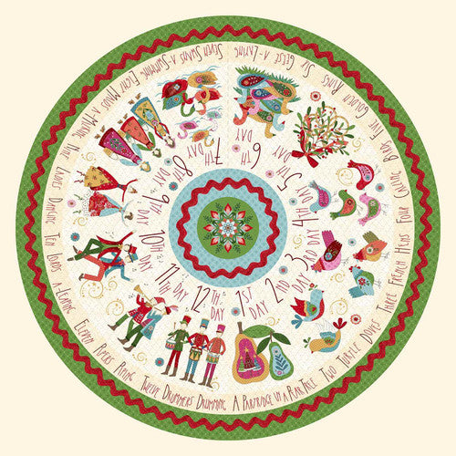 Create a festive, heirloom-quality tree skirt with the Scandinavian Holiday Tree Skirt Panel by Mary Jane Carey for Henry Glass Fabrics. This charming circular design features whimsical illustrations inspired by the beloved Twelve Days of Christmas carol, reimagined in a delightful Scandinavian folk-art style. From “A Partridge in a Pear Tree” to “Twelve Drummers Drumming,” each verse comes to life with vibrant colors and intricate holiday details.