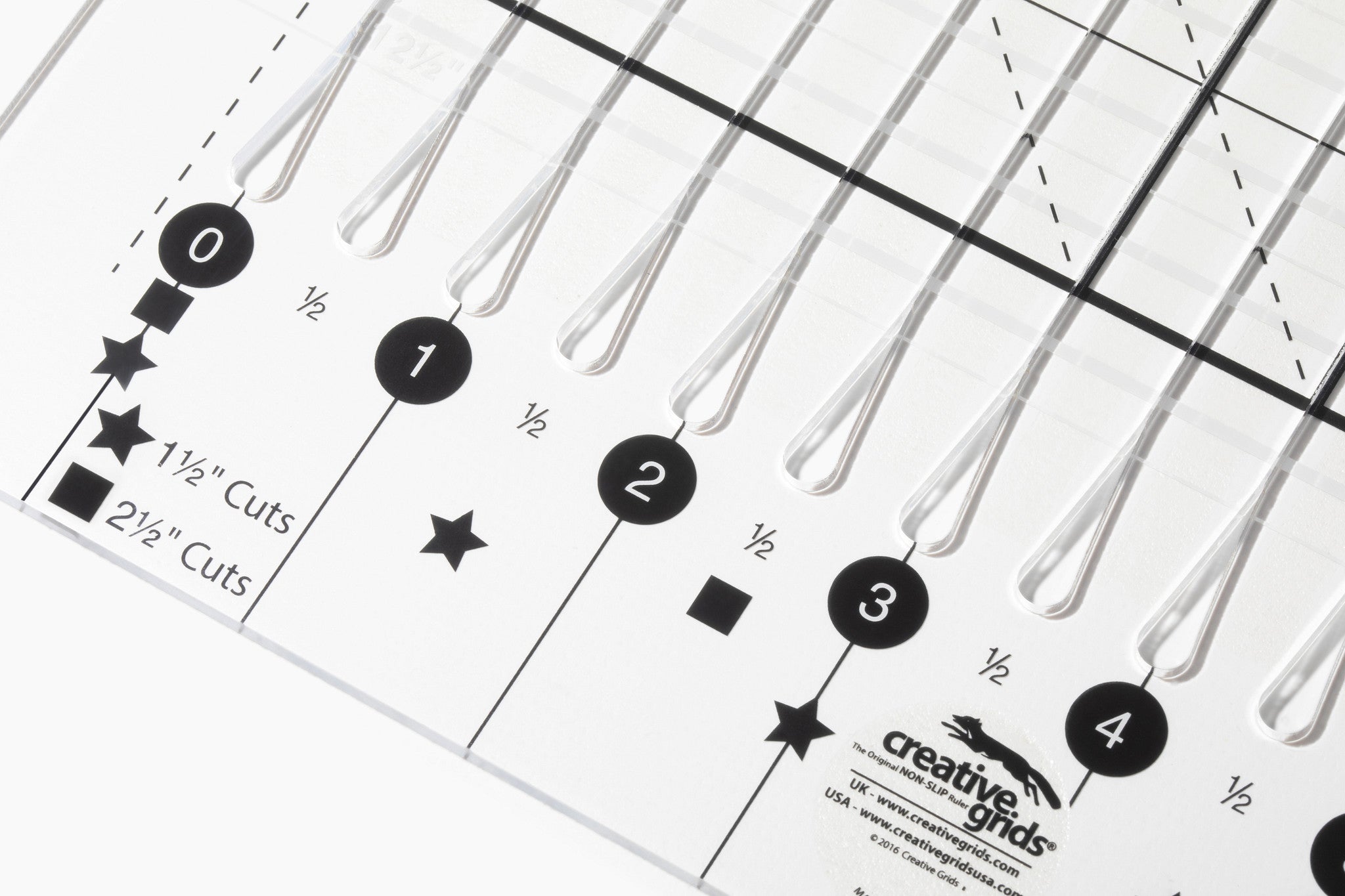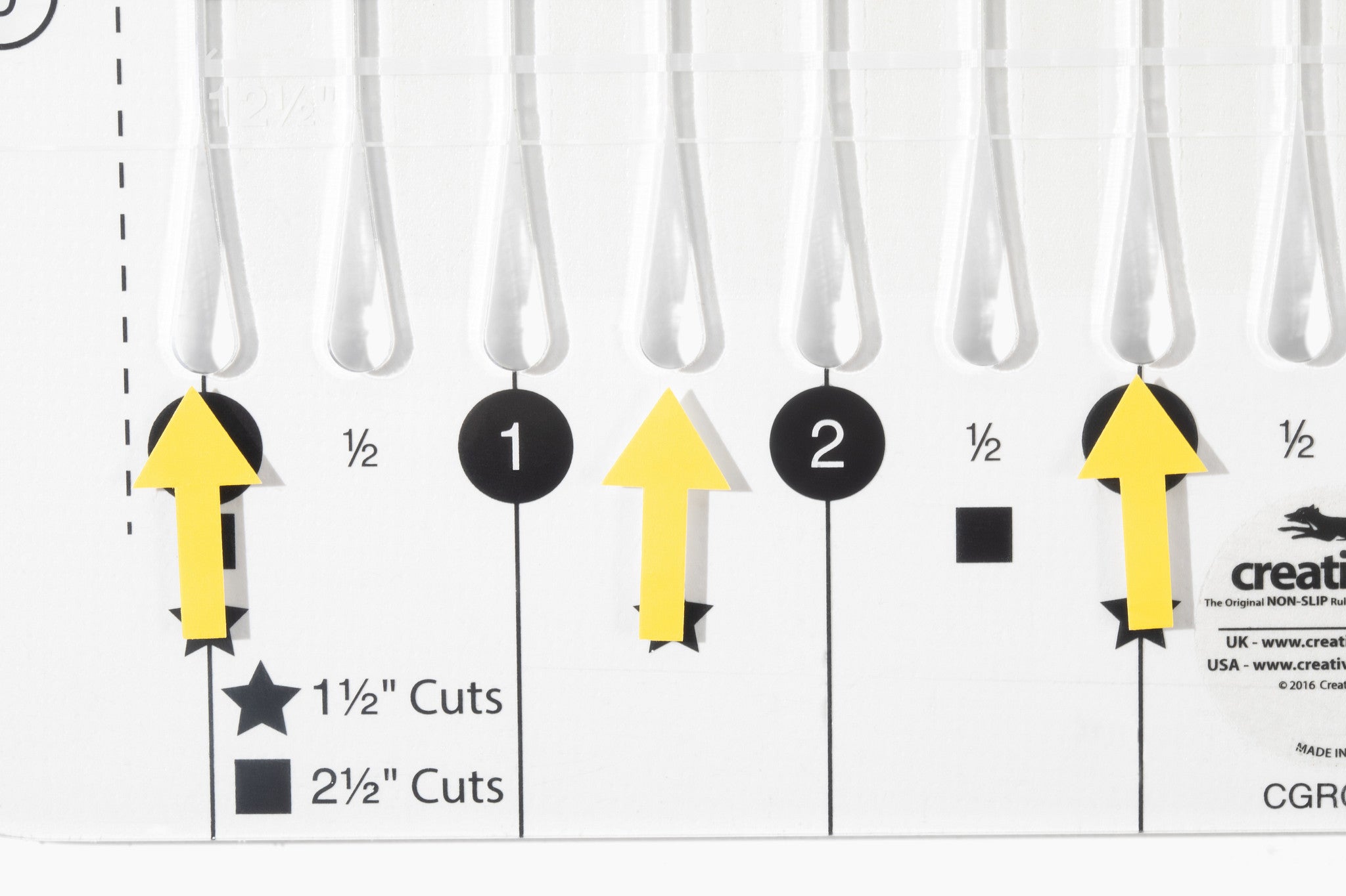 - Cut up to 5 strips at 2½″ or 8 strips at 1½″ without moving the ruler