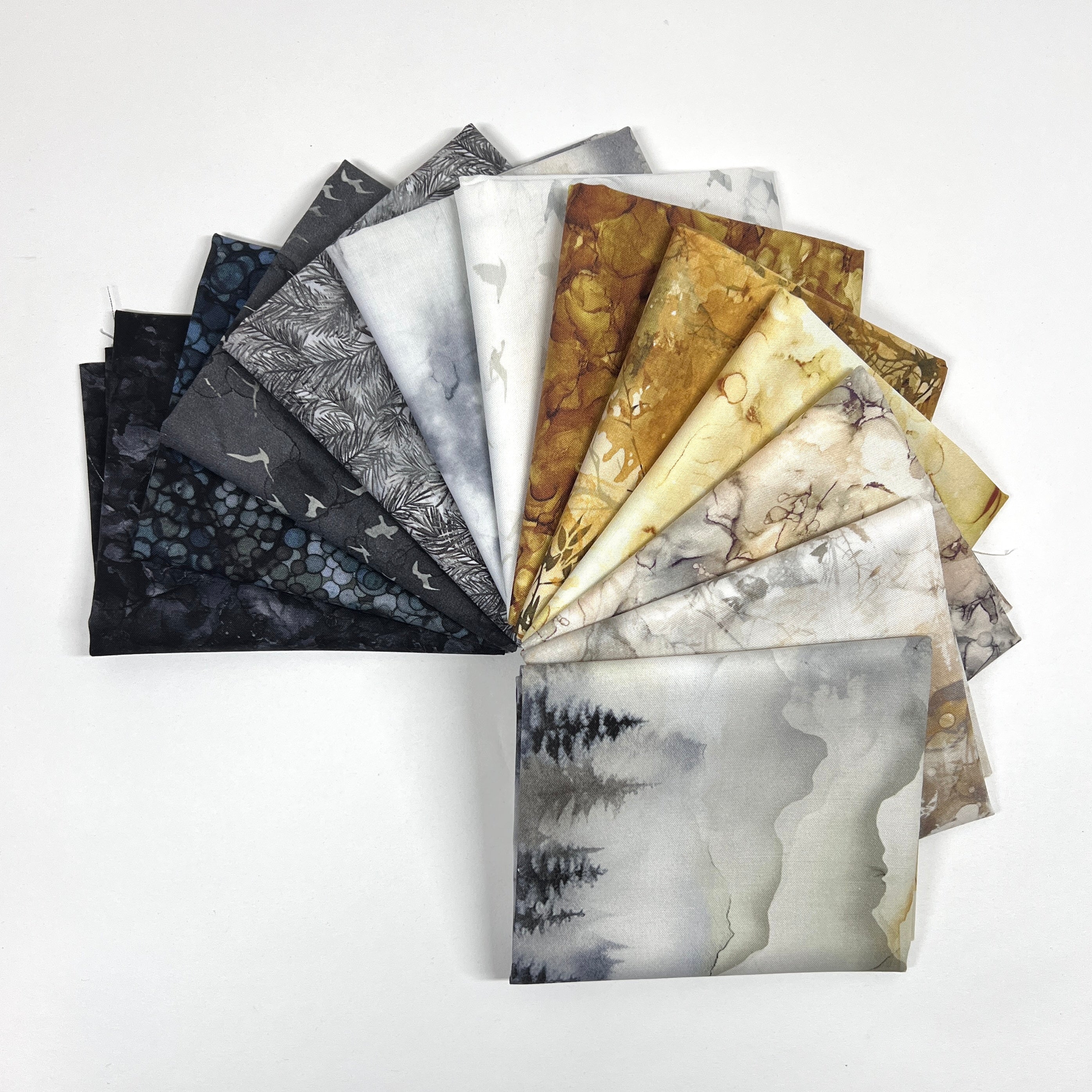 Capture the quiet beauty of a new day with Misty Morning, a serene 12-piece fat quarter bundle designed by Deborah Edwards for Northcott Fabrics. Inspired by soft fog, weathered stone, and the first golden light of sunrise, this collection blends moody charcoals and deep navy tones with gentle greys, warm taupes, and glowing amber hues.