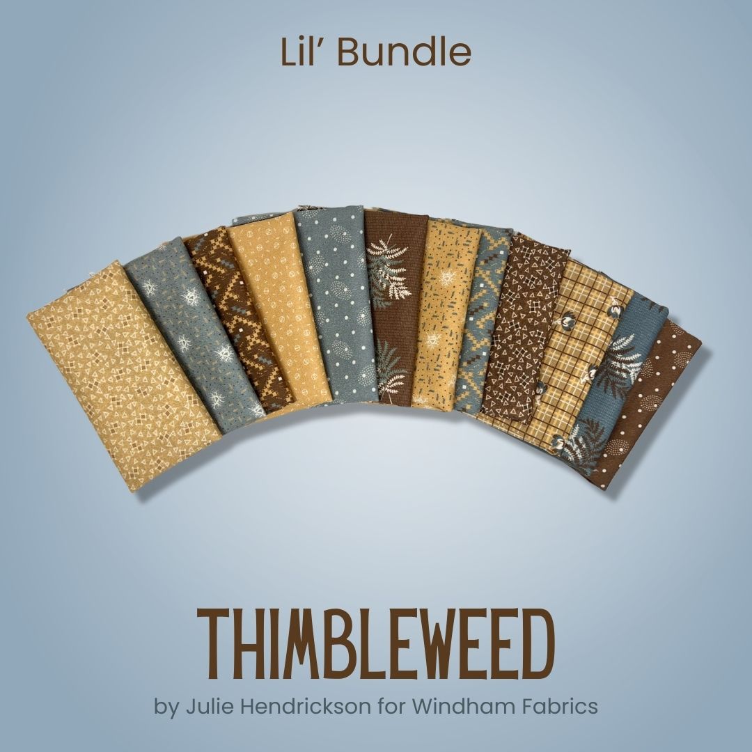 The Thimbleweed Lil' Bundle includes 12- 6"x21" cuts of fabric from the Thimbleweed collection by Julie Hendrickson for Windham Fabrics to create any GE Designs Lil' Table Runner. The lil bundle does not include fabric for 1/4 yard of binding.