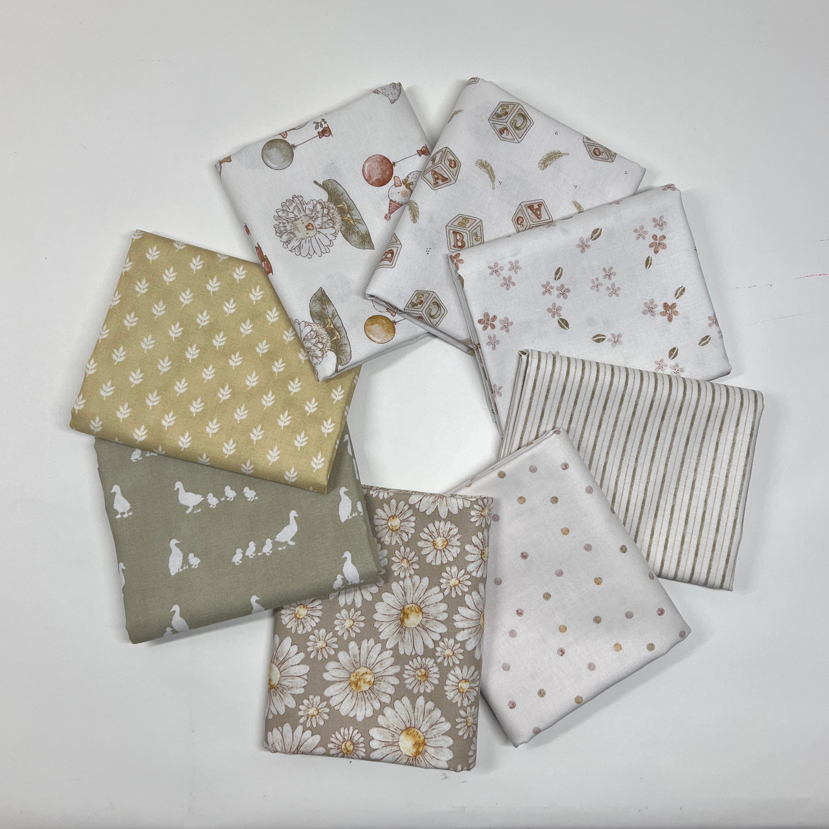 Sweet, soft, and full of charm, Tiny Waddles by Jessica Yon Lo is a delightful collection that brings gentle whimsy to your sewing projects. This 8 piece half yard bundle features a soothing neutral palette of warm creams, soft taupes, sage greens, and blush accents, paired with playful motifs like waddling ducks, delicate florals, subtle dots, and classic stripes.