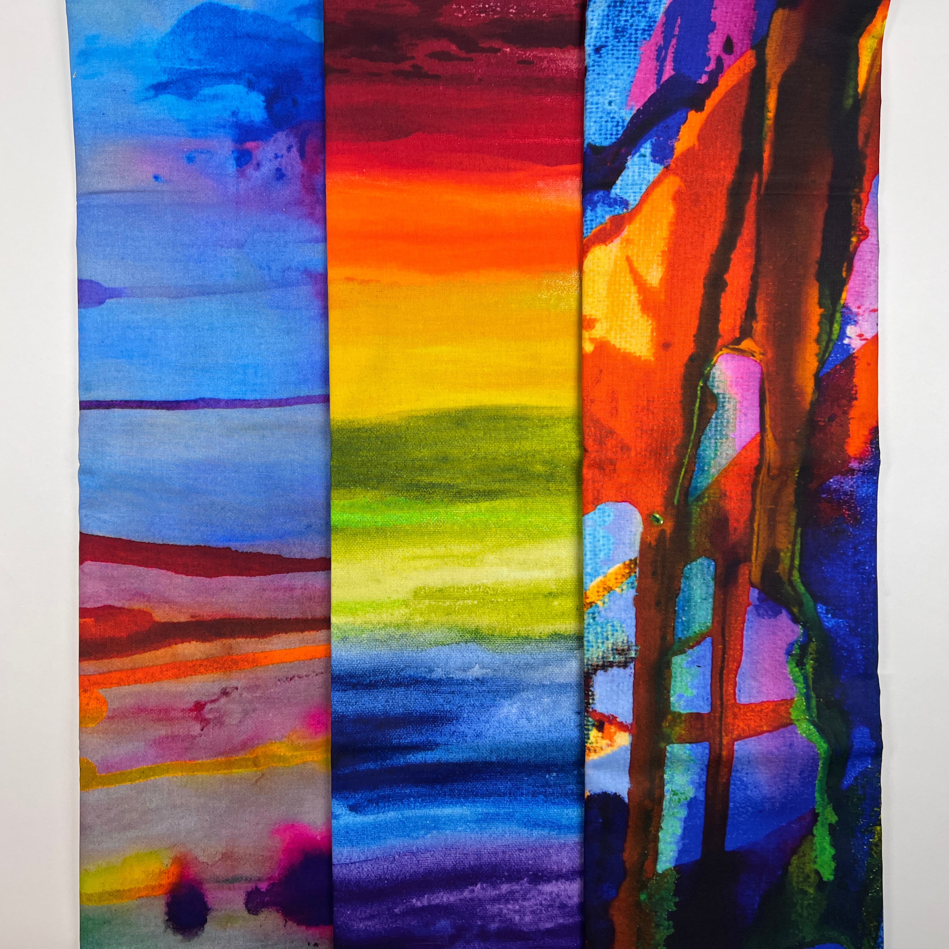 Transcendence embodies movement, color, and emotion - where art transcends the boundaries of the canvas to flow into fabric. The panel features an explosion of radiant drips and butterfly silhouettes, symbolizing creativity and transformation. The three coordinating 1-yard cuts echo the same painterly energy, blending washes of vivid hues - blues, purples, greens, and fiery oranges - that flow together like a sunset melting into dawn.