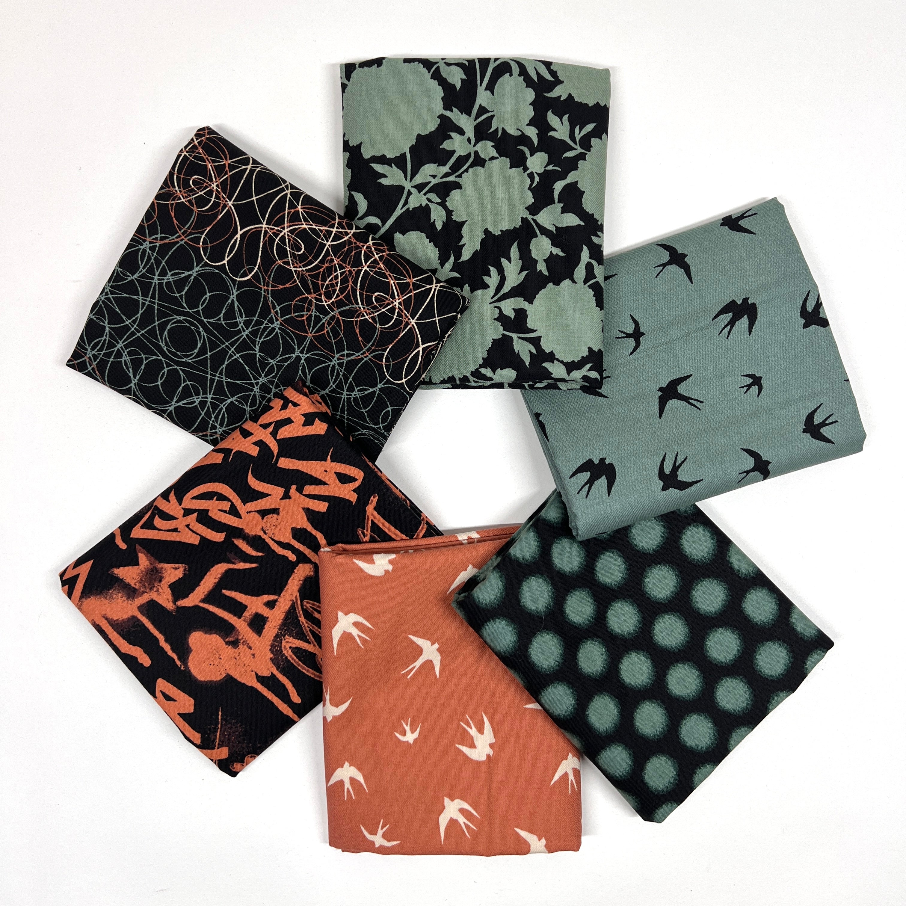 Verdigris by Libs Elliott for Andover Fabrics is a striking, modern collection that balances bold geometry with organic movement. This 6-piece half yard bundle features a rich palette of deep charcoal, oxidized greens, and warm rust tones - evoking the natural patina of weathered metal.