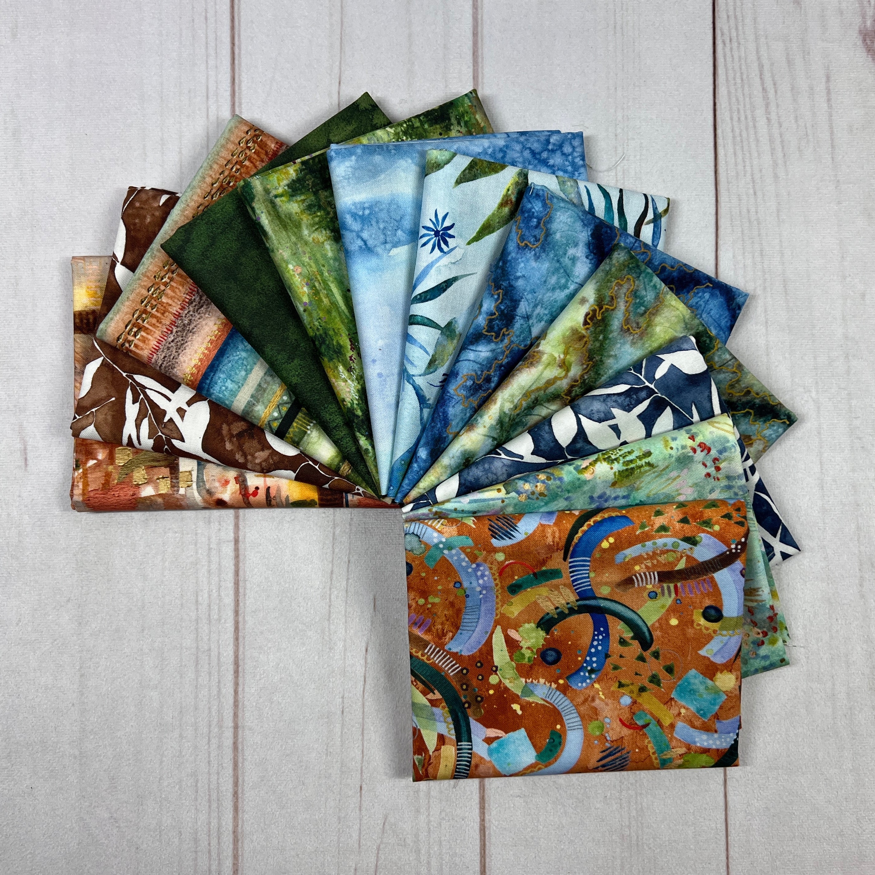 From lush forest greens and serene sky blues to layered bark textures and floral silhouettes, Wanderlust evokes the feeling of journeying through nature’s most enchanting landscapes. Each fat quarter offers a unique blend of movement and color — perfect for quilters, sewists, and makers who are inspired by the great outdoors.